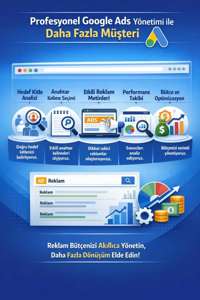 Reklam vermek kolaydır, ancak doğru yönetmek uzmanlık ister. Google Ads hizmetimizle bütçenizi kontrol altına alın, görünürlüğünüzü artırın ve daha fazla müşteriye ulaşın.
